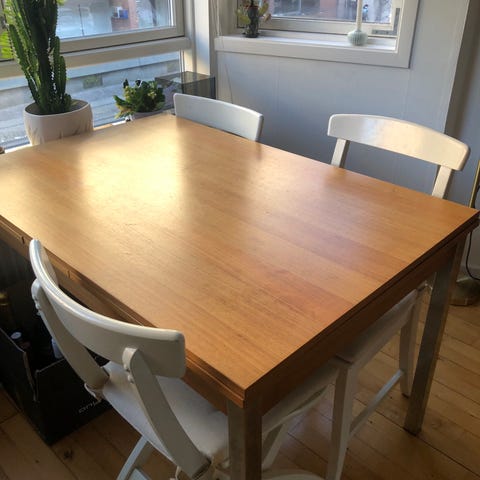 Spisebord/ skrivebord som er yderst praktisk. Det kan slås ud i hver ende med 27 cm ekstra pr. Plade ( hollandsk udtræk) fylder ikke meget da det måler 109/ 68 cm uden de to plader på 54 cm ialt.