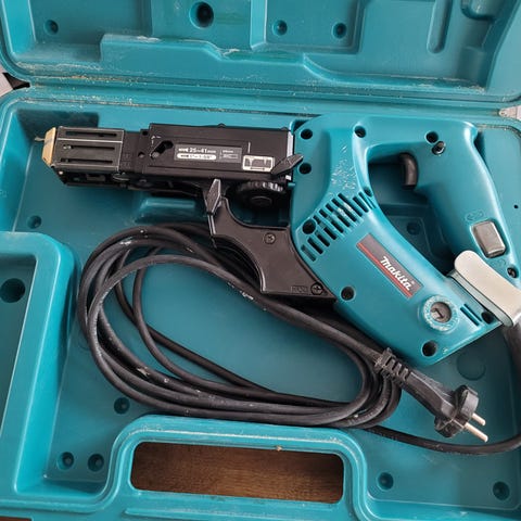 Makita 6833 gipsskruemaskine med automatisk skruefremføring. Det er en stærk og driftsikker maskine fra Makita, som stadig er utrolig populær til gipsmontage, trækonstruktioner, lofter og vægge. Maskinen tager skruebånd og giver hurtig, præcis og ensartet montering.