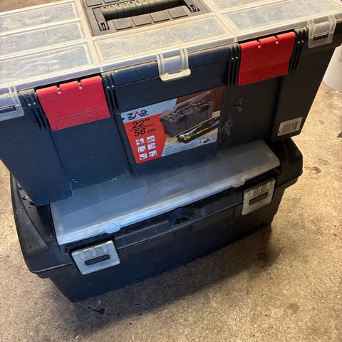Ryd disse 4 hylder fyldt med en masse skruer og plugs. Mange kasser halvt/helt og kvart fyldte i alle mulige størrelser