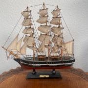 Cutty Sark 1869 modelskib lavet i træ med sort og rød farve. Skibet har detaljerede sejl og rigging, monteret på en sort stander. Velegnet til dekorative formål eller som samlerobjekt. Det forreste sejls fæstning er knækket og skal limes på.