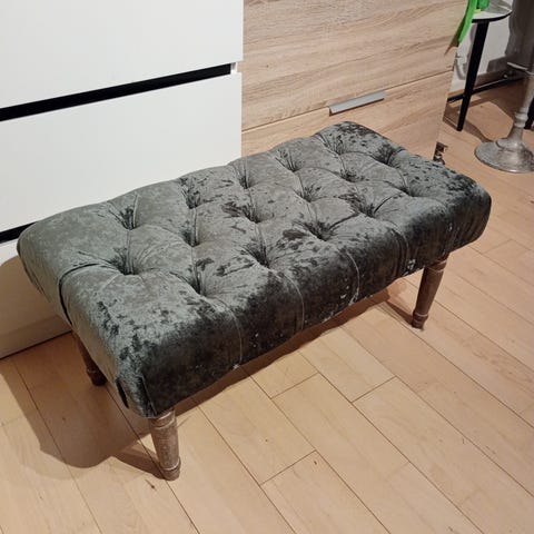Senge bænk i grå velour sælges, ingen brugsspor.
