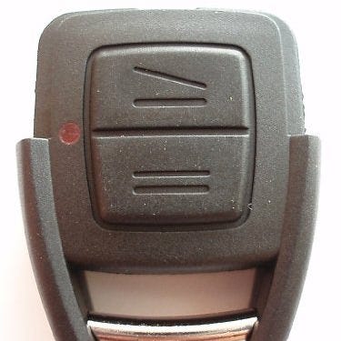 Opel nøgle fjernbetjening med tre knapper til oplåsning, låsning og bagagerum. Indeholder en udtrækkelig fysisk nøgle. Fremstillet i sort plast med metaldetaljer. Passer til specifikke Opel bilmodeller. Den fungerer til en Opel Mokka E, formentlig også andre.