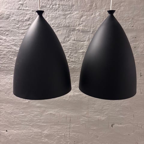 2 styks sorte metal lamper. 40 cm i diameter og 45 cm høj til toppen af det sølv gevind og 40 cm høj til toppen af det sorte.