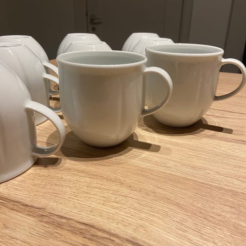 Rosendahl porcelænssæt bestående af hvide kaffekopper med hank og matchende tallerkener i hvidt porcelæn. Sættet inkluderer flere kopper og tallerkener i ensfarvet design, egnet til servering af kaffe og mad. Materialet er porcelæn, og designet er enkelt og funktionelt.