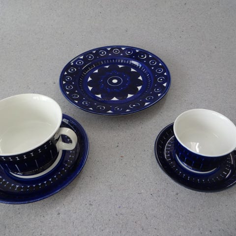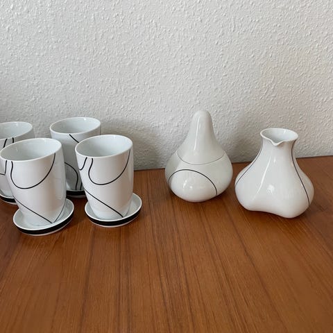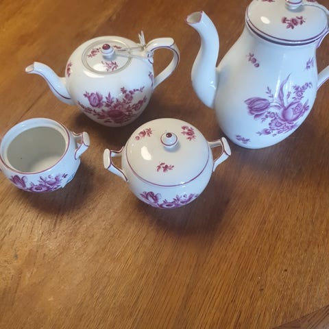 Der medfølger tekande, kaffekande, flødekande, sukkerskål samt teske.