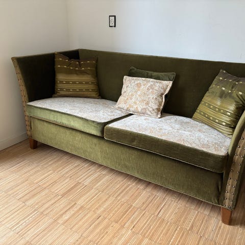 Sofa købt og importeret fra London. Der er et par tydelig pletter som giver patina. Eller som sikkert kan fikses i rens. Byd
