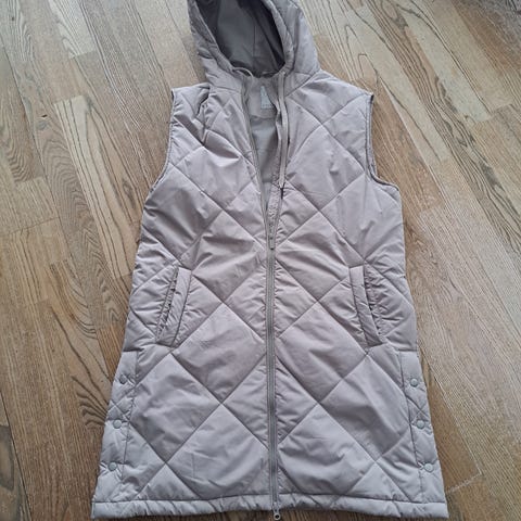 2-siddet vest med dobbeltstof rosa + lysegrå Med lynlås der går op i høj halsudskæring for ekstra beskyttelse. Den gammelrosa side vindstof har 2 stiklommer . Den grå side i polyesterfleece har også 2 stiklommer. Mrk. FIVE Str. 44-46. Brystvidde 108 cm. Længde 62 cm
