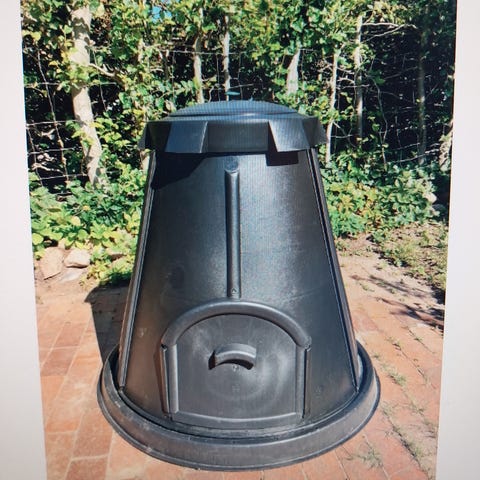 Kompostbeholder i grøn plast. Mærke HUMUS. Velegnet til haveaffald og organisk materiale.