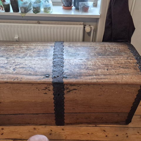 Antik dragkiste gives væk. Smukke farver med god plads i kisten, der er meget stabil. Kisten måler 129×52×52 cm