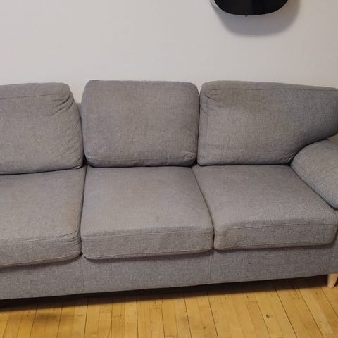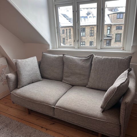 Har stået i kælder og lugter derfor af kælder. Alcantara betræk på puder, der kan lynes af og vaskes i vaskemaskine.