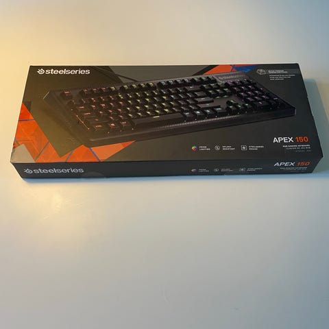 SteelSeries Apex 150 tastatur med sort farve og USB-forbindelse. Designet til brug med computere og udstyret med standardtaster. Kabel tilslutning forbundet via USB.