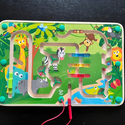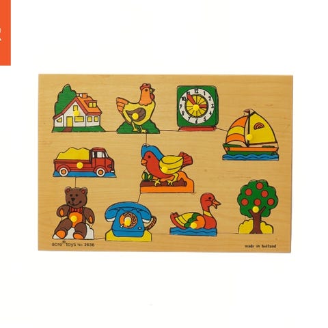 Trælegetøj bestående af farvede geometriske former i blå, rød, gul og grøn. Inkluderer cylindre, firkanter, trekanter og rektangler i forskellige størrelser. Leveres med en træplade med udskæringer til formene. Egnet til børn til læring af former og farver.