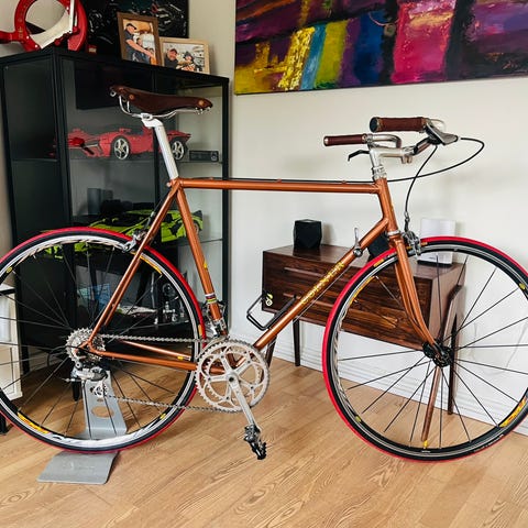 Colnago Super. Forgaffel, forhjul og forbremse er uoriginale dele. Jeg har kørt dagligt på den ind til sidste år og den kører fint selv om kranken har lidt slinger og vist gerne vil have nogle nye kugler i kuglelejet. Rettet er lidt skævt men det tror jeg nemt kan rettes ud. Jeg synes den fortjener en ejer som vil renovere den.