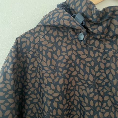 Let regn jakke str xl med hætte skjult i kraven og reflekser forneden. Med lynlås og trykknapper. Polyester. Bm ca 2x68 længde 84. evt. Unisex.
