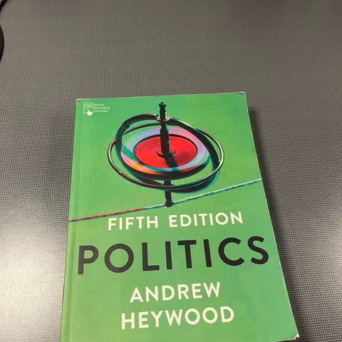 ”Politics”, Andrew Heywood. Hæftet indbinding, 5. udgave. Udgivet i 2019 af Macmillan International. 528 sider, illustreret i farver.