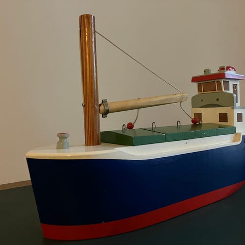 Træfigur af en skibskaptajn håndskåret i træ. Figuren forestiller en mand med hvidt skæg, iført en hvid og sort kaptajns hat, orange jakke, blå og hvide stribede trøje, brune bukser og sorte gummistøvler. Figuren står på en firkantet træfod. Ca 20 cm.