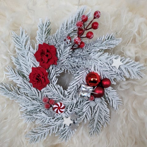 Med små røde bær, sukkerpynt stjerner og plast gran. Kan bruges både ude og inde.