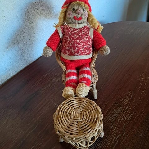 Håndstrikket retro nissedukke i rødt og hvidt strik med lange ben og fine detaljer som fletninger, hue og tørklæde.
