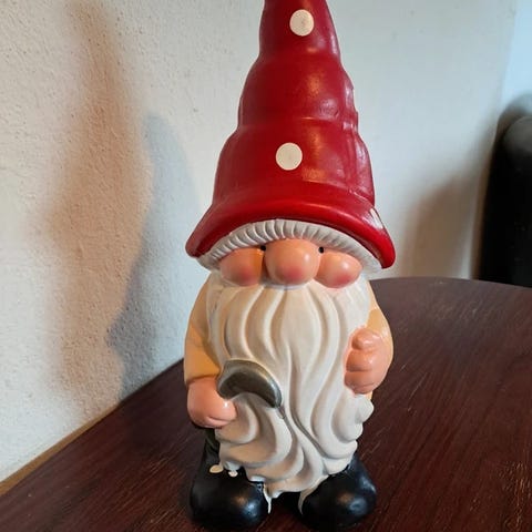 Retro nissefigur i malet keramik/gips, forestillende en nisse med rød hue, forklæde og små hængende dekorationer i hænderne. Højde ca. 19 cm, vægt ca. 223 g. Formentlig fra 1990’erne til begyndelsen af 2000’erne, hvilket giver den et klassisk og nostalgisk udtryk.