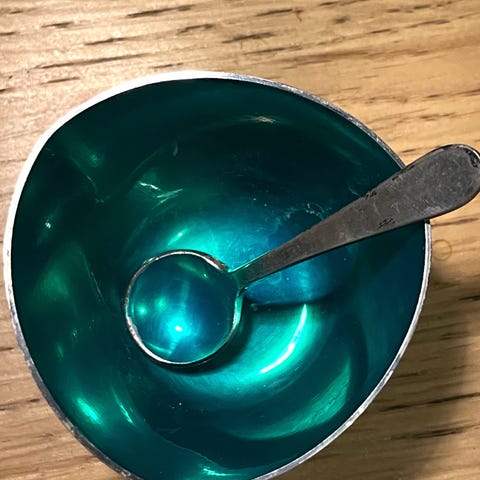 Antikke sølvsalt kar med skeer