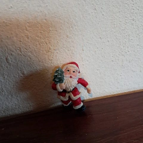 Dansk: Retro julefigur forestillende julemand i cremefarvet dragt med guldmønster, pelskanter og klokke i huen. Han holder en gavepakke i den ene hånd og har en lille guldfarvet engel på kappen. Højde ca. 22 cm, vægt ca. 70 g. Materiale ukendt, men formentlig en kombination af stof, plast og pap. Formentlig fra 1990’erne til begyndelsen af 2000’erne, hvilket giver den et nostalgisk vintage-præg.