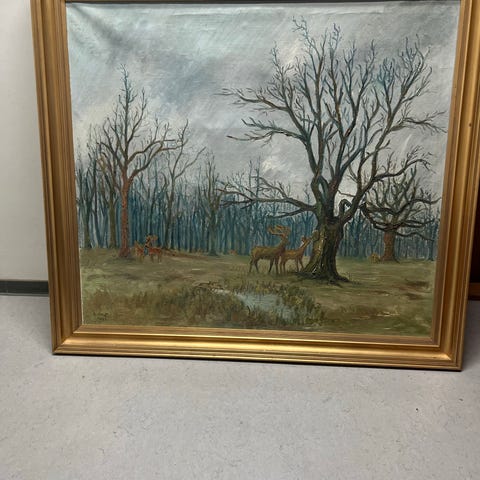Maleri af hjort i skov, kan ikke lige se hvem der har lavet den, tror der står noget med Chris Lind....