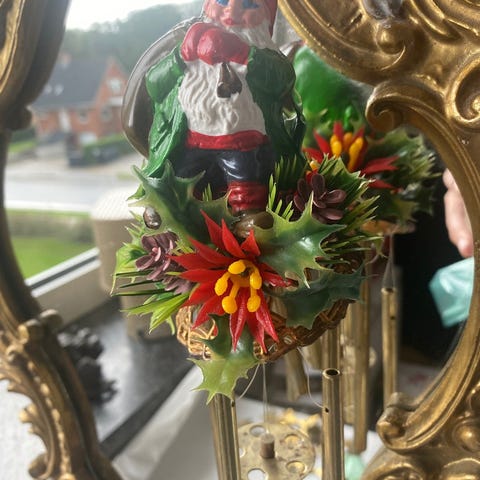 Retro juleophæng med julemand, udført i malet keramik/gipslignende materiale. Motivet forestiller en julemand i klassisk rødt tøj og sort bælte, placeret i en grøn julekrans dekoreret med rødt bånd og kristtorn. Forsynet med snor til ophæng. Bagsiden er ensfarvet grøn. Højde ca. 12 cm, vægt ca. 99 g. Formentlig fra 1990’erne til begyndelsen af 2000’erne.