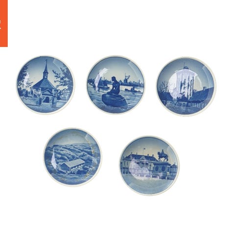 Dette er et sæt af seks årsplatter, hver med en diameter på 8,5 cm. Platterne har en blå-hvid farve og illustrerer forskellige danske motiver og seværdigheder såsom Frilandsmuseet, Hvidovre Kirketårn og Langelinie. Bagsiden af hver platte har en skriftspecifikation, der identificerer motivet og årstallet for udgivelse.
