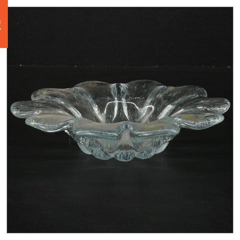 Denne skål er lavet af glas med en tekstur, der minder om bølger. Den har en blomsterlignende kant og en rund form med en diameter på 18,5 cm. Denne skål kan bruges til servering af frugt eller som dekoration på et bord. Den klare glas giver et elegant og rent udseende.