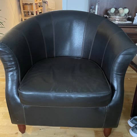 Meget velholdt og lækker lænestol i et tidløst design. Den er i ægte mørkebrunt læder og kan læne tilbage i en hvileposition med en let og pæn fod i krom.