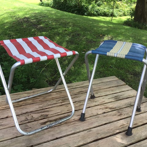 Stolene er i virkelig fin stand, og stoffet har det helt rigtige nostalgiske udtryk med fine striber, der giver associationer til sommerhus, kolonihave, campingliv og sol ved stranden. Perfekte til dig, der elsker klassiske friluftsmøbler med charme og patina.