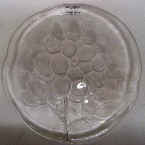 Glas, Fade , Kosta Boda Grape, Kosta Boda , lille fad l 21cm ø 17cm,75kr. 1 fad ø 26cm x 26cm 100kr. - 1 flad fad 32x32cm 150kr., 1 flad fad 37x34cm 175kr. serien Grape motiv vindruer. design Ann Warff, fra