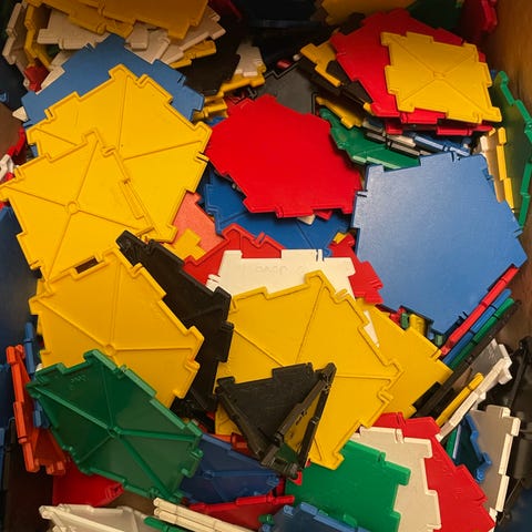 En kæmpe samling plastikbrikker formet som trekanter, kvadrater og femkanter - der kan samles i kanten. også særlige brikke iblandt.
