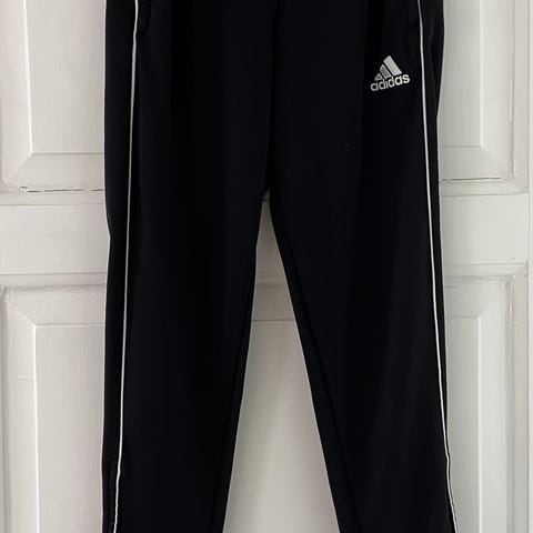 Adidas træningsbukser i størrelse M, designet til unisex brug. Bukserne er sorte med hvide striber langs siderne og fremstillet i Primegreen materiale, som er en serie af genanvendte materialer. Velegnet til forskellige sportsaktiviteter.