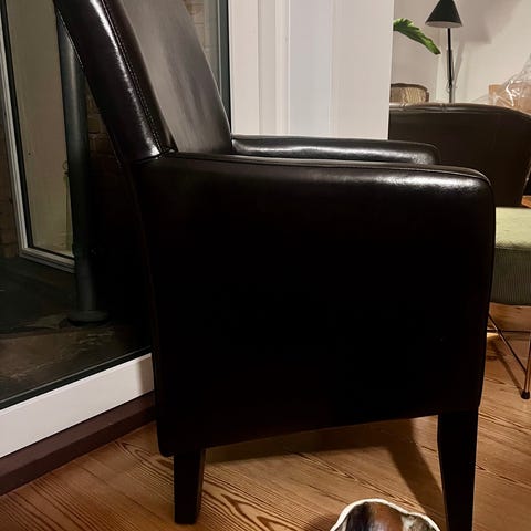6 spisestuestole i re-genereret læder sælges. 200kr pr. Styk