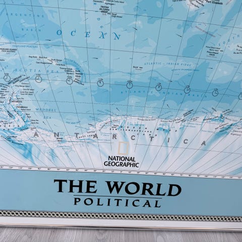 Lamineret verdenskort med metal kanter og ophængesnor,