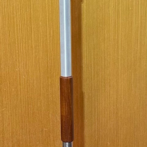 Standerlampe i teak med messingbånd, bakelit fatning med afbryder og hæve sænke funktion.