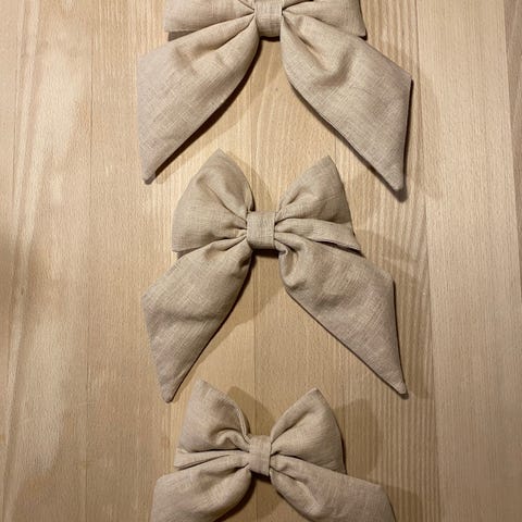 Sløjfe i mørkerød satin/polyester.. Sløjfen har en stor og fyldig form med lange ender. Fyld af pudefiber. 17 cm.. Den kan anvendes som bordpynt, dekorationer, hænges op overalt. Og som hårpynt eller til accessorizing af tøj eller tasker. Sælges for kr. 75. Sendes mod fragt. Afhentes i Skive eller Viborg.