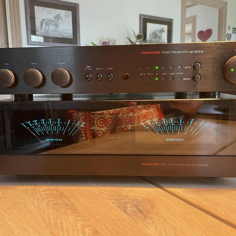visuelle lydniveauindikatorer og justeringsmuligheder. Enheden har et klassisk design med analoge målere og knapper til finjustering af lydindstillinger. Velegnet til brug i hjemme-lydsystemer.