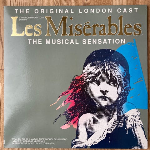 Original London Cast Album af Les Misérables, musical soundtrack på vinyl. Indeholder musik og tekster fra den originale produktion. Pladen er i standard størrelse og designet med coverillustration af karakteren Cosette fra musicalen.