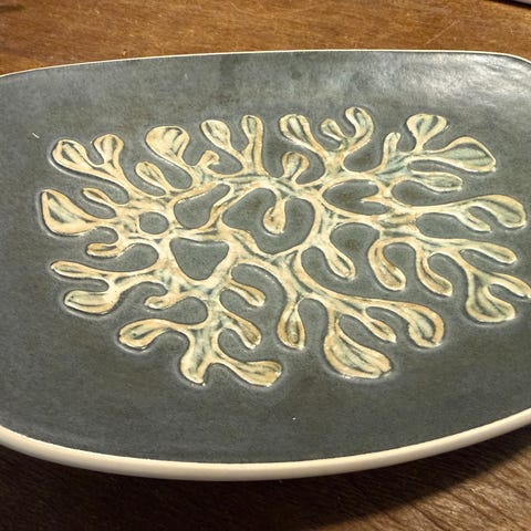 Rigtig stort og flot keramik fad med flot spil i glasuren. Det er lavet af stentøj/ lertøj og håndrejet. Jeg usikker på hvem der har lavet det, men ville gætte på at det er noget ældre dansk brugskeramik