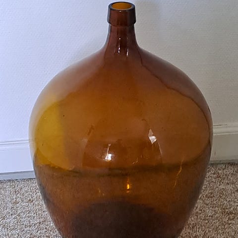 Ca 9 cm i diameter. Med lædersnor til ophæng