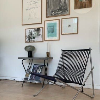 Stolene er med stel af metal og sæde af flagline, designet af Poul Kjærholm.