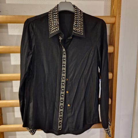 Tøjpakke med pæn sort buks, læderleggings med brede ben, fest/glimmer buks fra Rabens. Silkelook skjorte fra Anine Bing, fin see through med mønster, ny med pris tag, alt str S 36/38. 2 støvletter str 38