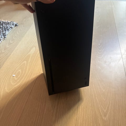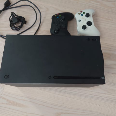 Microsoft Xbox Series X spilkonsol i sort farve. Konsollen har en kompakt og lodret design. Med følger 1 xbox elite controller v2 med .