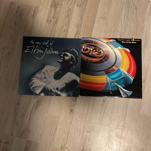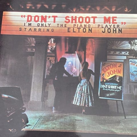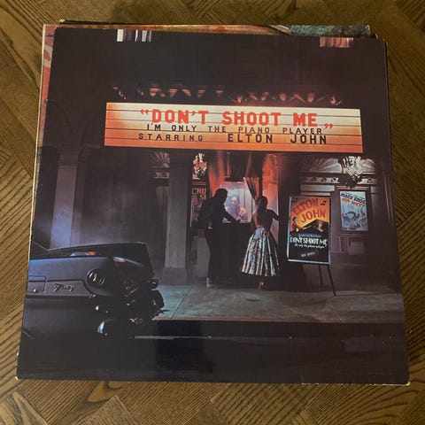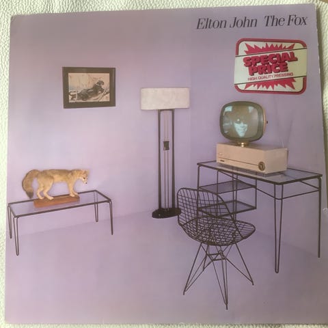 Elton John vinylplade med cover, der viser kunstneren iført en tigerprint jakke. Coveret indeholder billeder af Elton John i forskellige outfits og omgivelser. Produktet er velegnet til samlere og fans af Elton John.kun afhentning i Roskilde