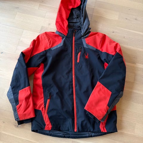Super lækker skijakke i farverne orange, mørk orange og sort . Mærke : Spyder. Størrelse 104.