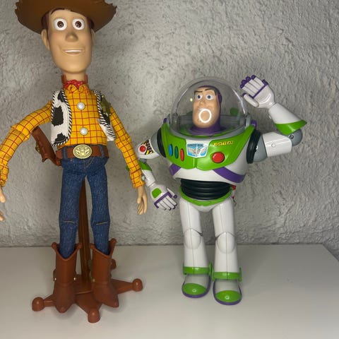 Disney Toy Story sæt med tre actionfigurer: Woody, Jessie og Buzz Lightyear. Figurerne er lavet af plastik og har bevægelige led. Woody og Jessie har cowboytema med hat og tøj i karakteristisk design. Buzz Lightyear er i rumdragt med detaljer som vinger og knapper. Figurenes størrelse er cirka 15-20 cm. Egnet til samling eller leg.