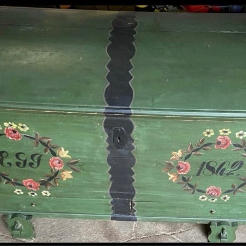 Antik trækiste med grøn maling og dekorative mønstre i lysere farver. Kisten har et låsespænde foran og står på fire ben. Egnet til opbevaring og som dekorativ møbelgenstand.