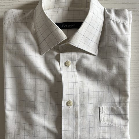 2 BOSWEL Skjorter til herre i størrelse 42. Skjortene har et ternet mønster i blå nuancer og grå er fremstillet i bomuld. De har lange ærmer og en brystlomme på venstre side. Skjortene har knaplukning foran og en klassisk krave. Materialet og designet gør den velegnet til hverdagsbrug.